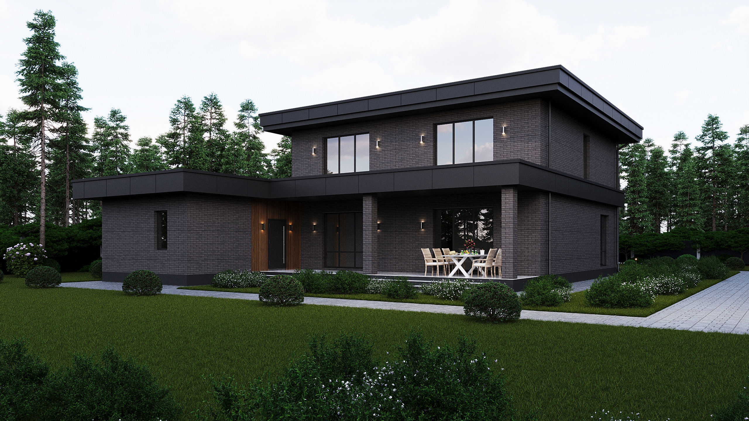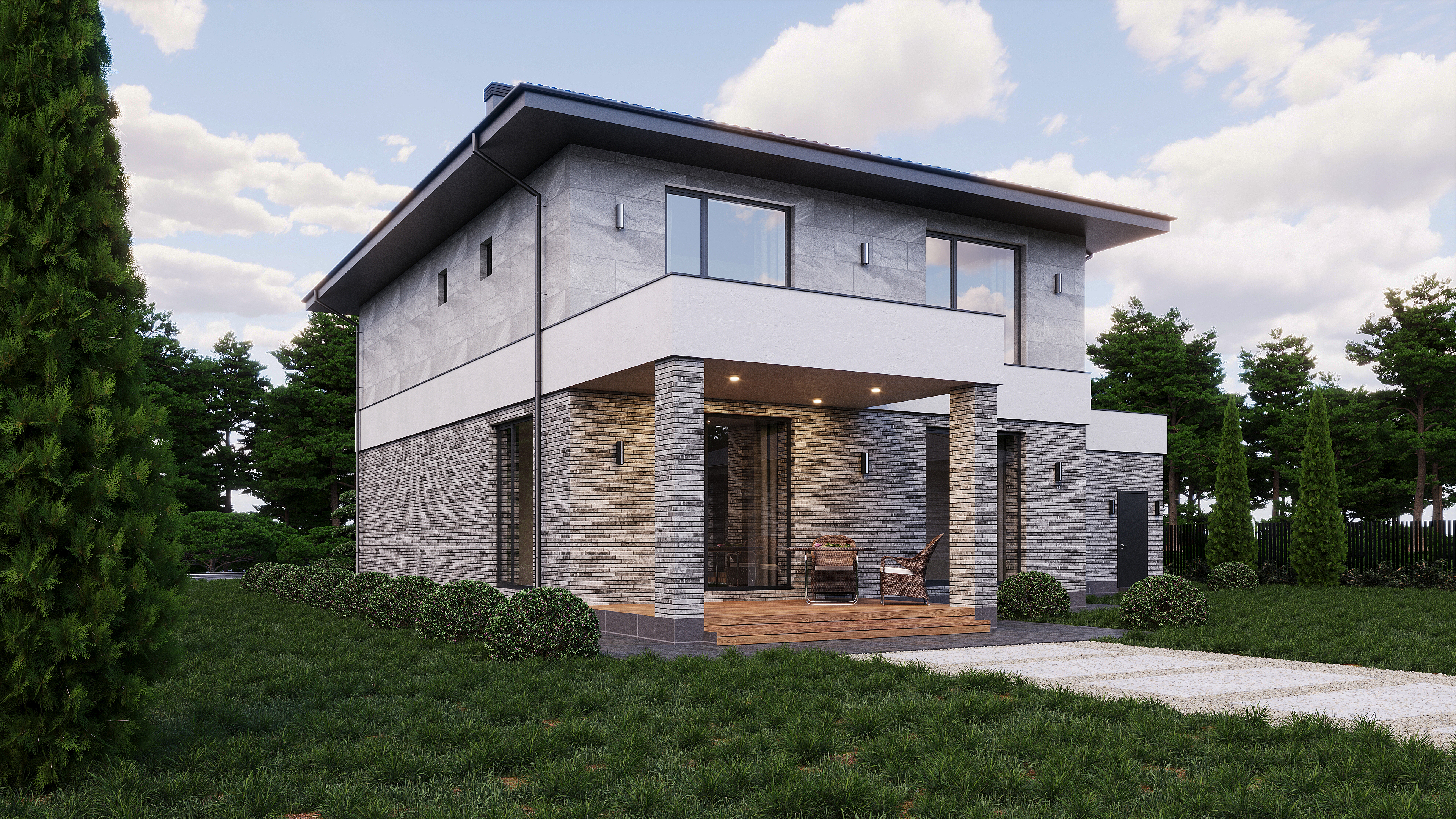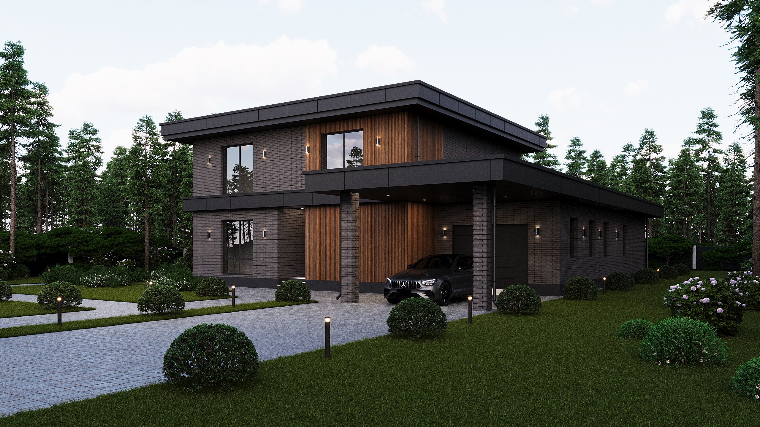 Проект Видный сочетает в себе современные фасадные строгие и правильные линии с естественными и теплыми тонами деревянного планкена на фасаде, что в свою очередь делает дом визуально солидным но уютным.