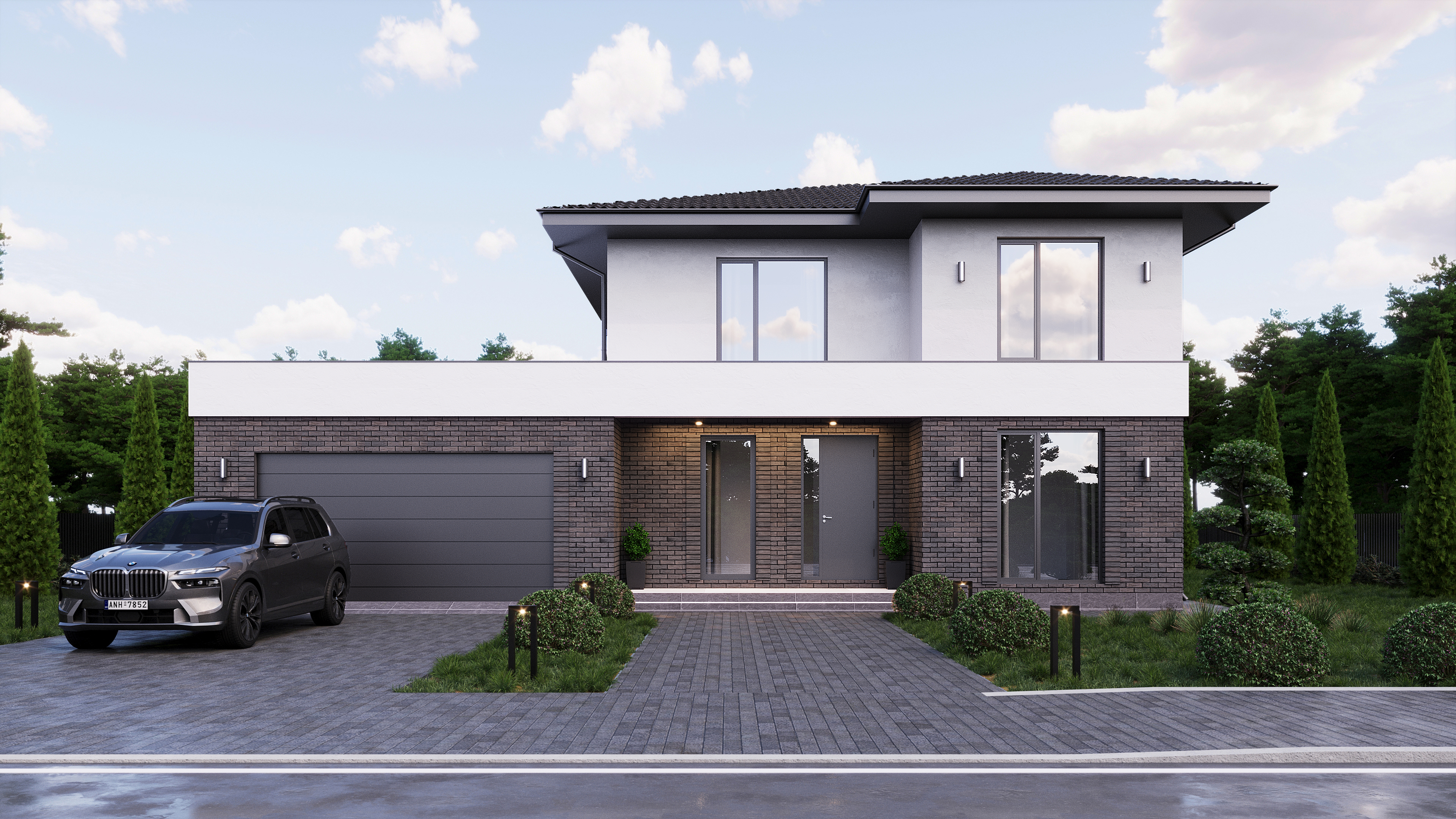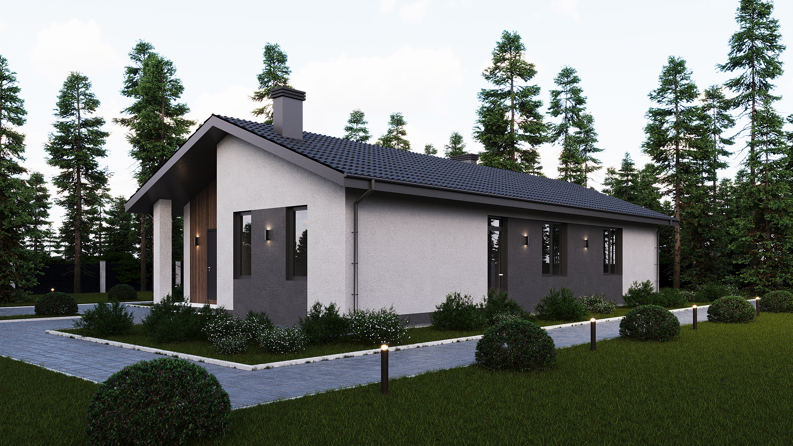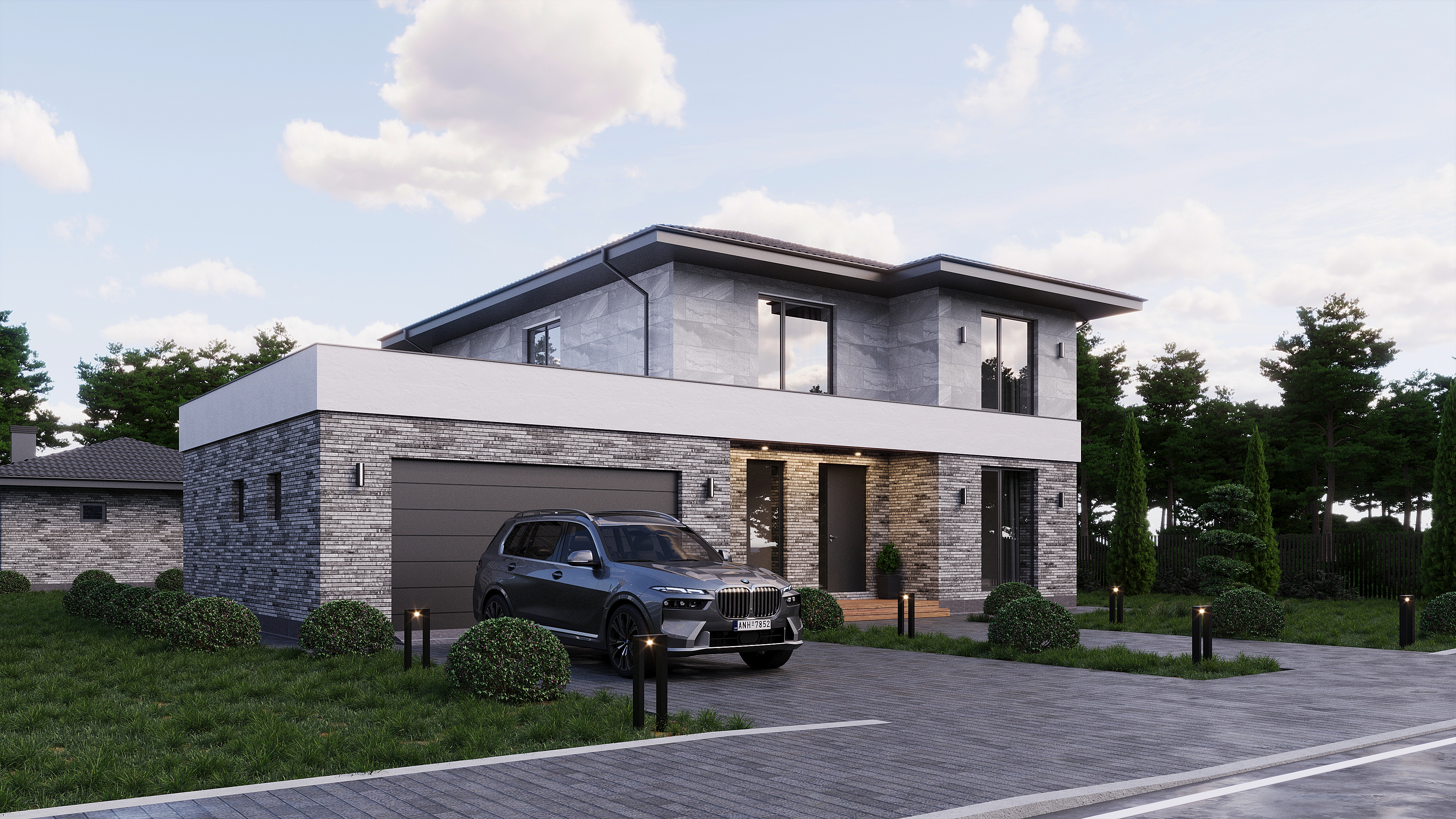 Проект Видный сочетает в себе современные фасадные строгие и правильные линии с естественными и теплыми тонами деревянного планкена на фасаде, что в свою очередь делает дом визуально солидным но уютным.