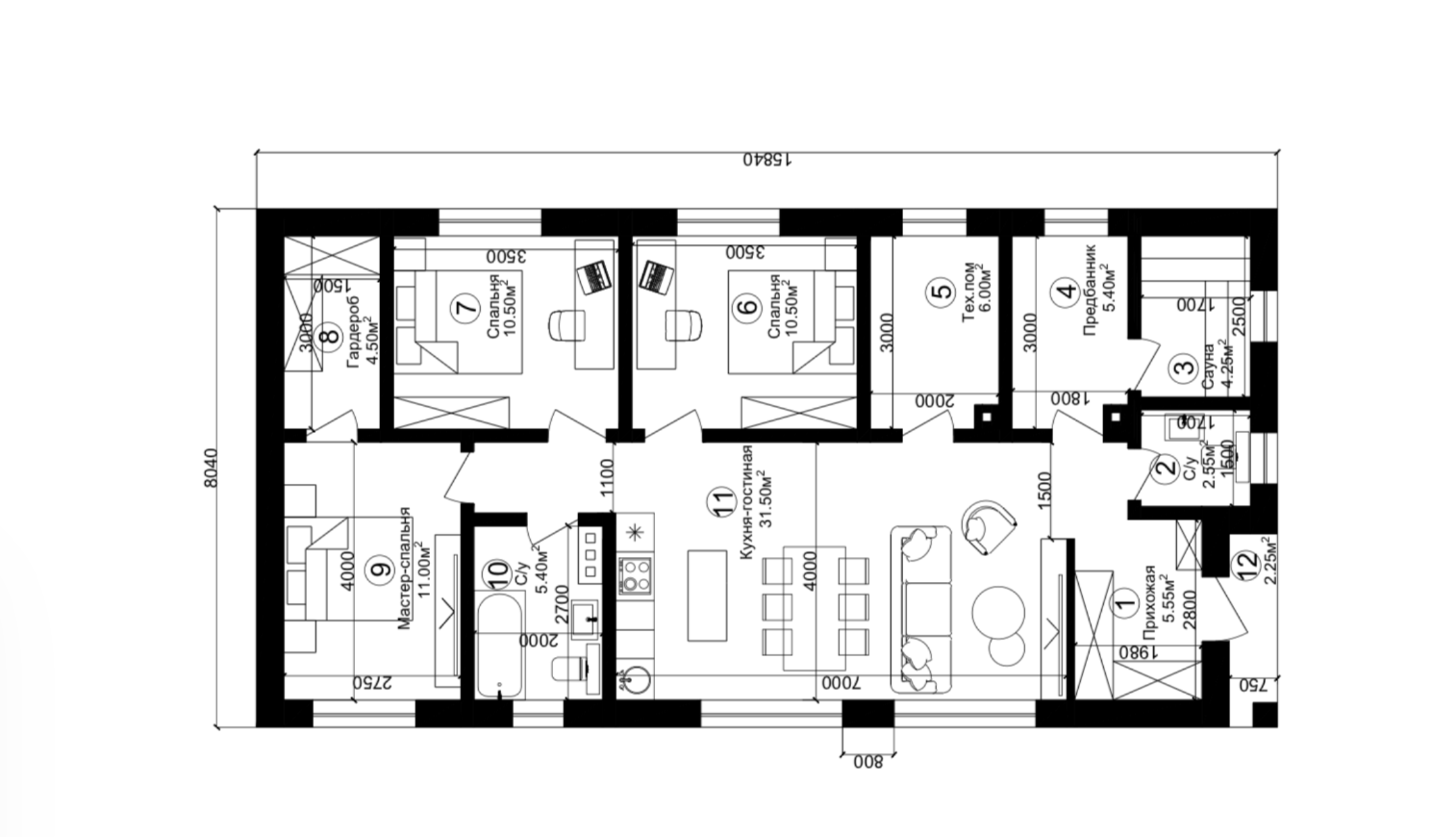 Прямо в доме расположен банный комплекс с комнатой отдыха, который поможет наслаждаться жизнью в своём доме в полной мере.