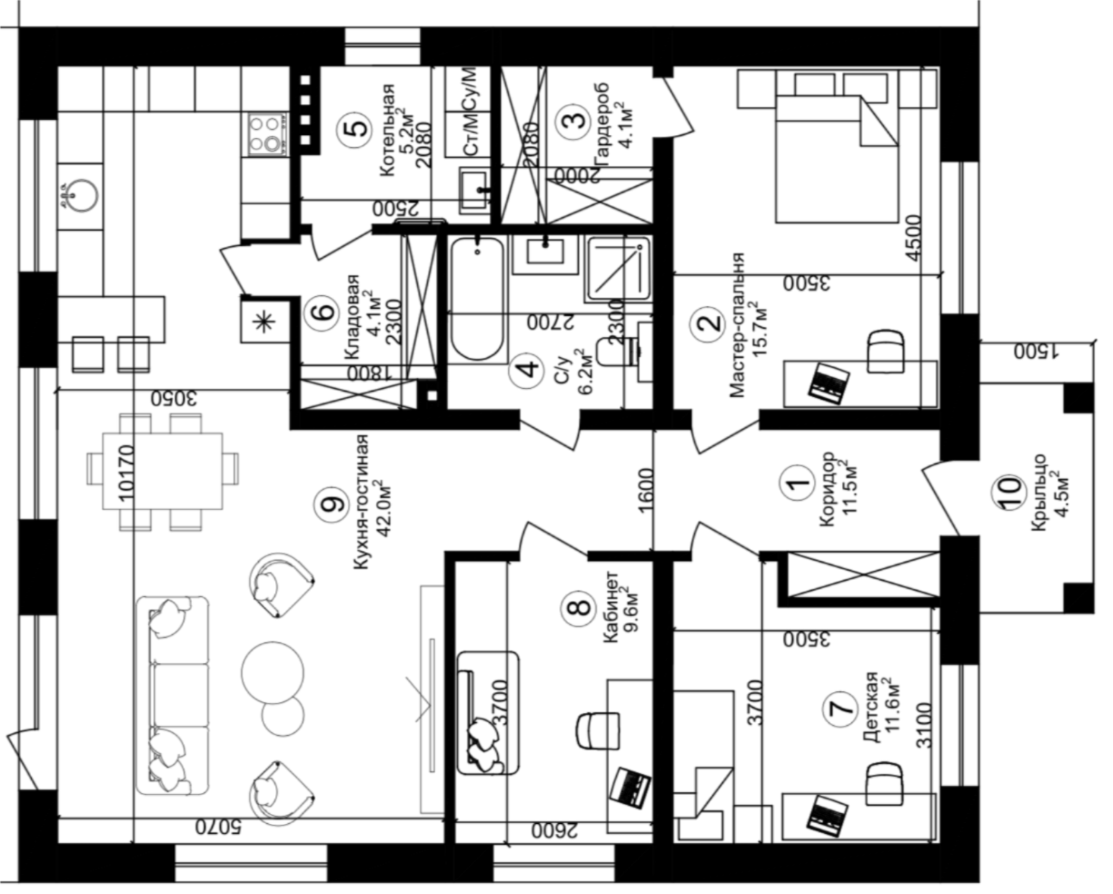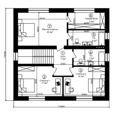 Три спальни для каждого члена семьи одна из которых мастер спальня со своей просторной и светлой гардеробной и отдельным санузлом, приватное пространство для хозяев дома.